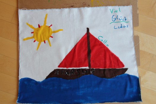 Beim Abschiedsfest von Lukas und Katharina haben alle Kinder eine STARSHIPFLAGGE kreiert und gemalt. 12 Flaggen für 12 Monate auf See. Eine schönere Erinnerung an die lieben SchulkollegInnen gibt es gar nicht. Und zum Dank wollen wir die Flaggen, die Wind und Wetter gut überstehen, mit etwas „Patina“ wieder zurückbringen.