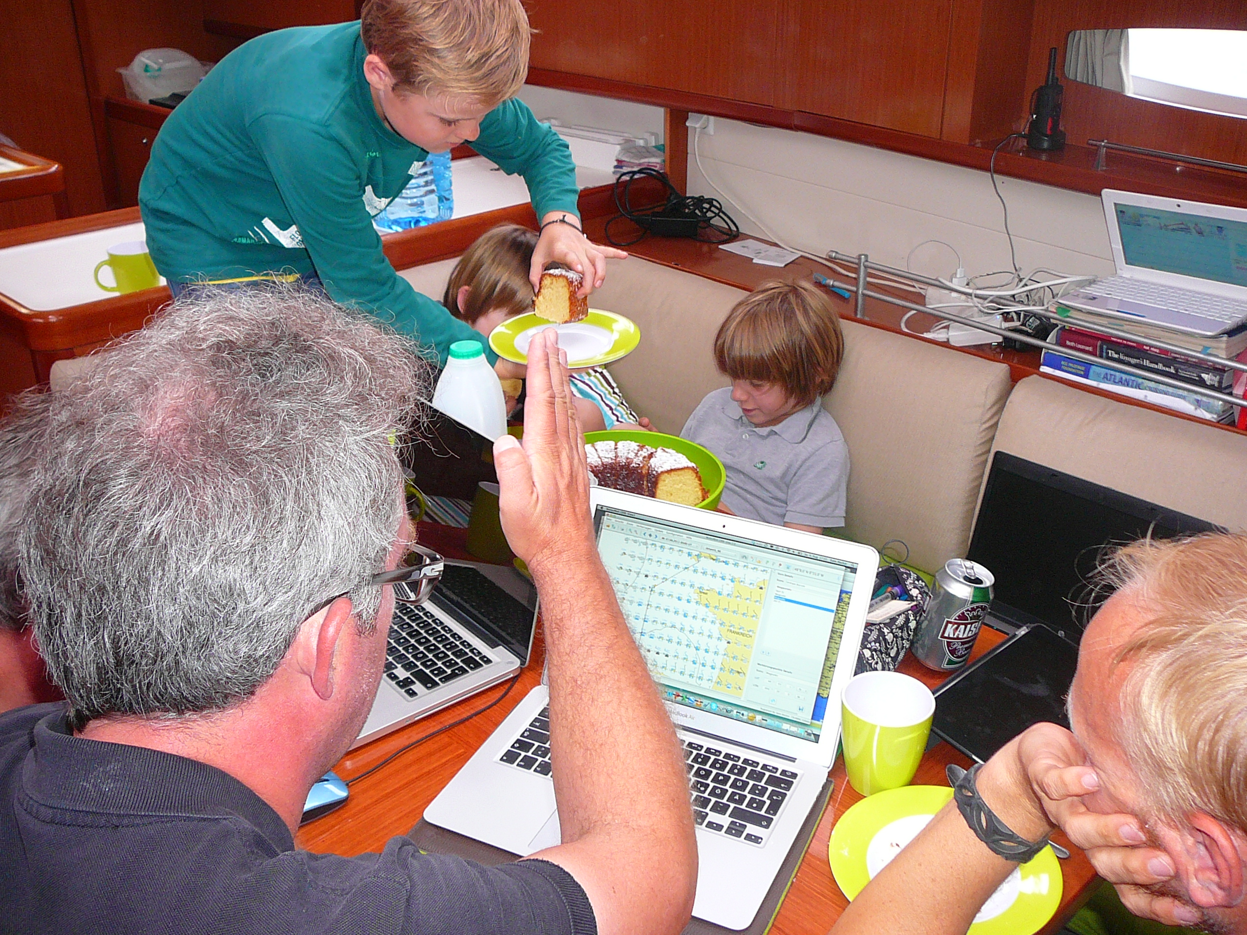 Um 15 Uhr treffen wir uns alle zu „Kaffee und Kuchen“ auf der Starship, um die Überquerung der Biskaya zu planen.