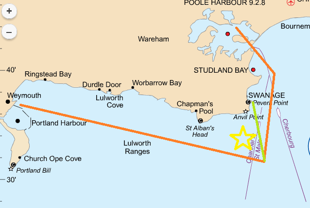 Gegen 14 Uhr legen wir ab. Die ersten zwei Stunden bei 15 kn Wind passen gut und gegen 16 Uhr passieren wir die Bucht von Swanage. Der direkte Weg in die Bucht von Weymouth bleibt uns verwehrt, denn sehr unangenehme Rip Tides mit kurzen, sehr hohen Wellen versperren uns den Weg (gelber Stern auf der Karte). Daher müssen wir einige Seemeilen hinaus in die hohe See.