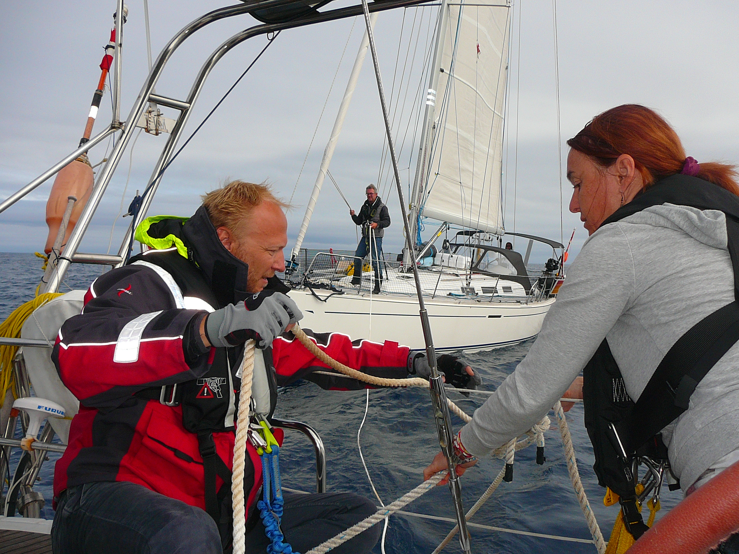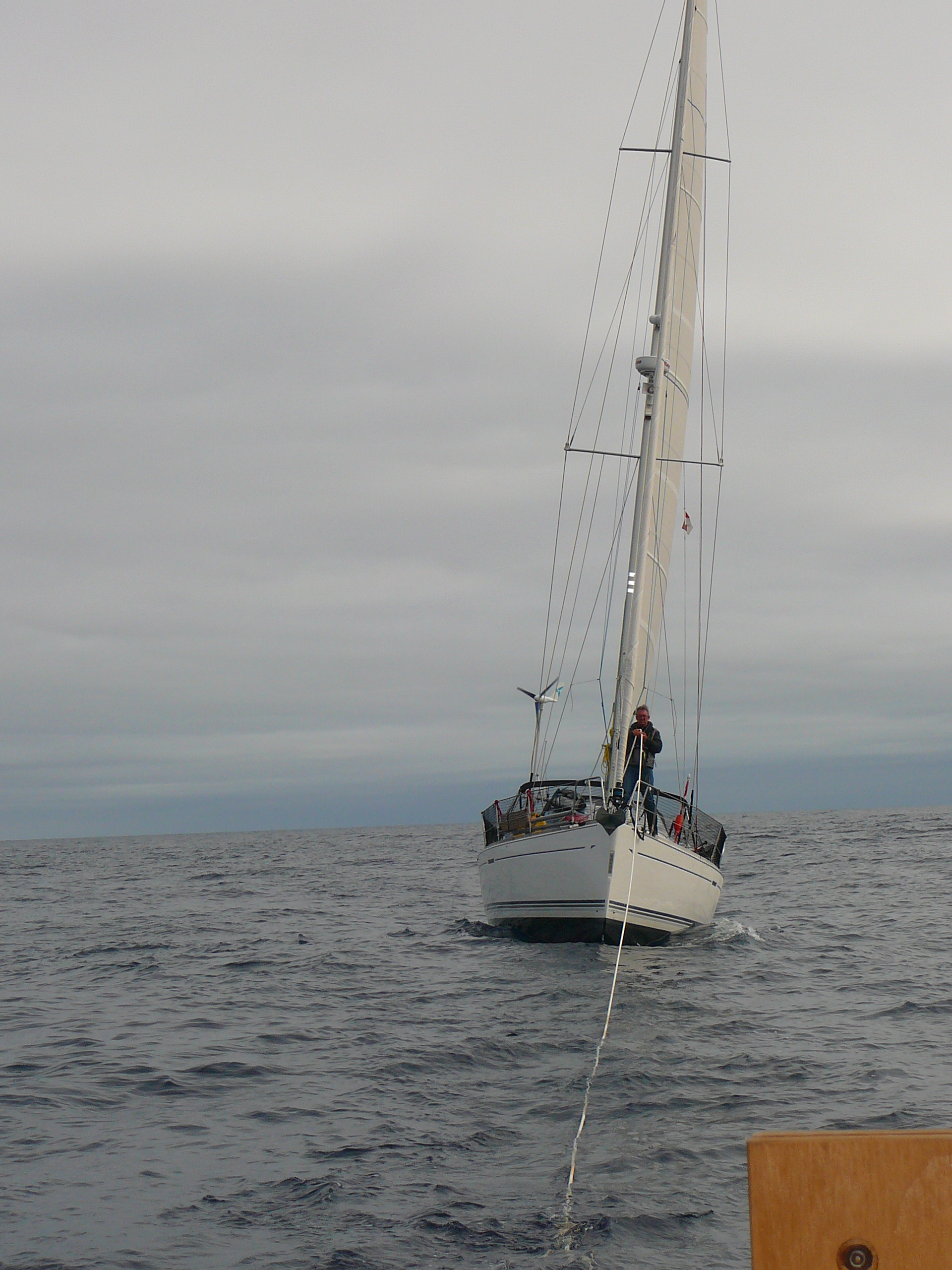 Die Lichtmaschine dürfte defekt sein, lädt die Servicebatterien nicht und somit können sie trotz vollen Dieseltanks kaum mehr als eine halbe Stunde unter Motor fahren. Solange genug Wind aus einer guten Richtung zum Segeln da ist, kein Problem, aber wenn die angekündigte Flaute mitten auf der Biskaya tatsächlich einsetzt, dann hängen sie im Nichts herum. Da wir d auf der Starship nicht lange herumgefackelt und sofort zurück gefunkt: „Klar, sobald die Flaute da ist, schleppen wir euch!“
