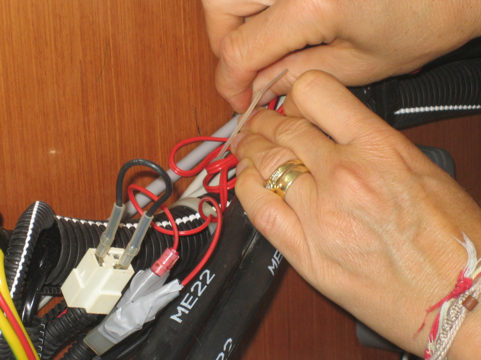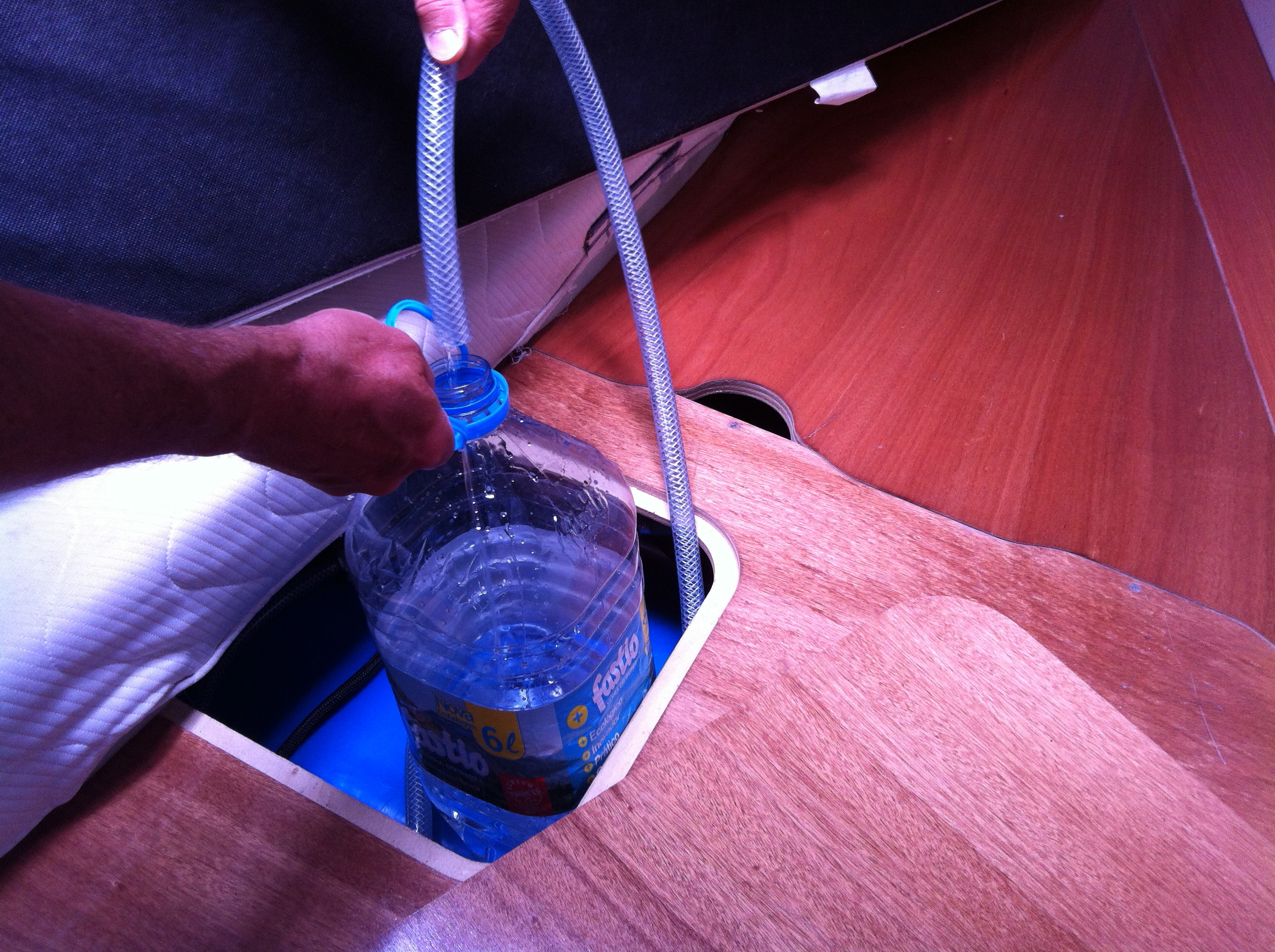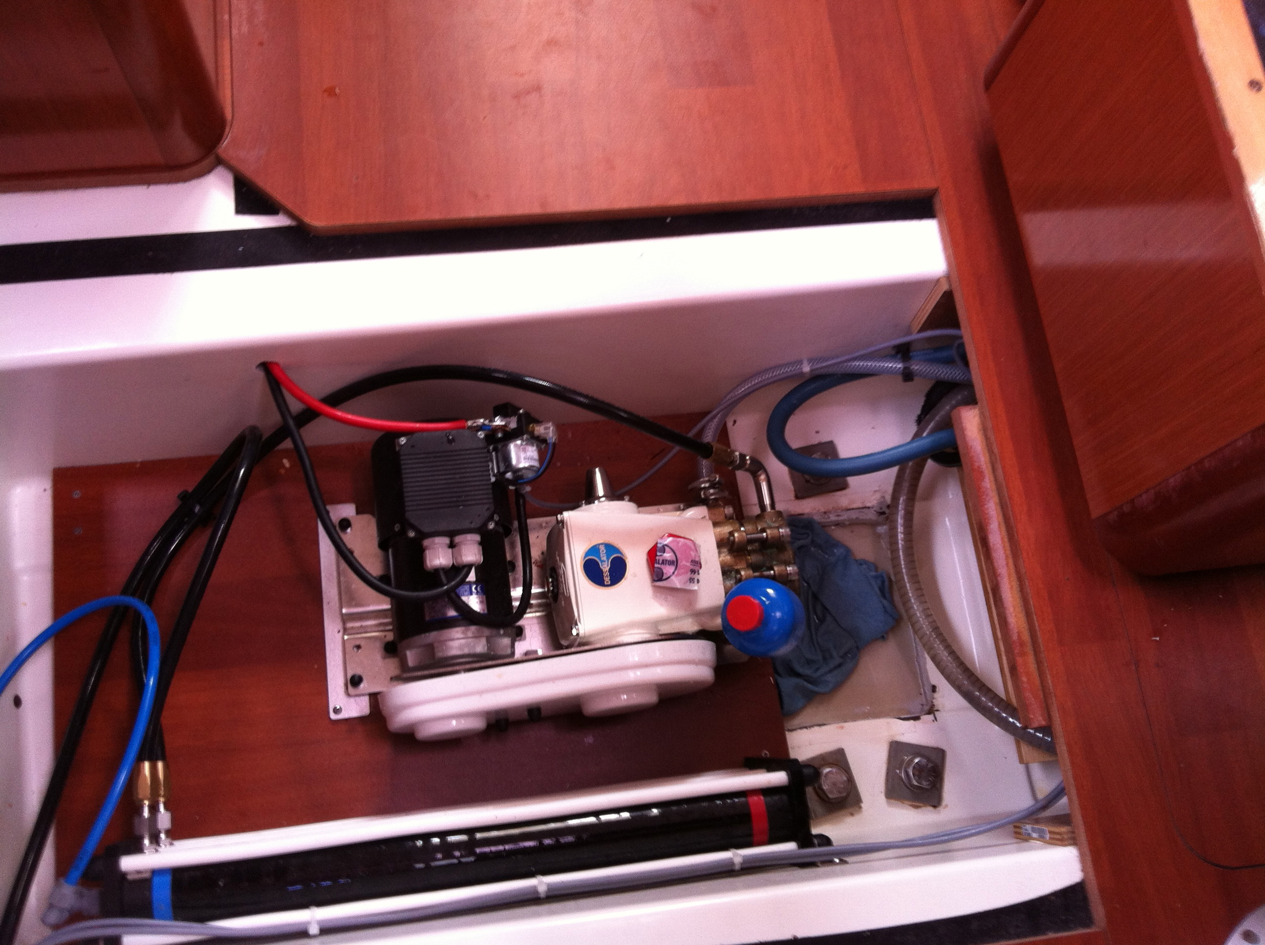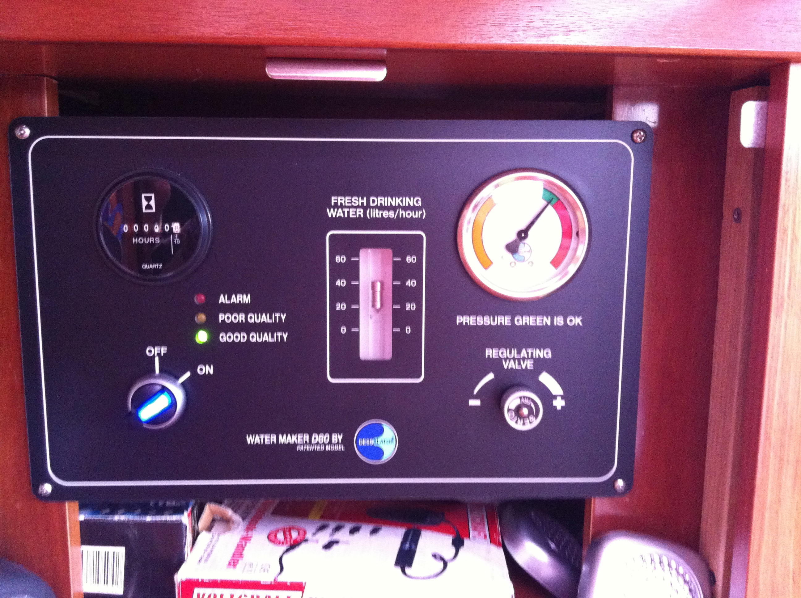 Eigenartig ist nur, dämmert uns nach dem erfolgreichen Manöver, dass wir den Frachter auf unserem Plotter nicht gesehen haben. Auch die nächsten zwei sehen wir nur in Natura, aber nicht auf dem Plotter. Hat unser AIS ein Problem? Dietmar hängt sich in die Steuerbordbackskiste und meldet zurück: „Powerlampe“ leuchtet nicht. Drei Minuten später sitzt Dietmar mit Stablampe, Schraubenzieher und dem Voltmeter in der Backskiste – bei 25 Kn Wind und ca. 2,5 Meter hohen Wellen. AIS wird nicht mehr mit Strom versorgt. Uns bleibt wenig Zeit, uns Gedanken zu machen, warum das so ist. Vielmehr brauchen wir eine Lösung, denn eine Nachtfahrt ohne AIS nur mit Radar ist wesentlich aufwändiger. Denn AIS zeigt nicht nur Größe und Geschwindigkeit eines Schiffes an, sondern auch genau den Kurs und den Kursvektor, sodass wir leicht ausrechnen können, ob wir auf Kollisionskurs sind oder locker davor oder dahinter kreuzen können. Der Zufall hilft. Am Vortag hat Dietmar noch eine provisorische Ankerbeleuchtung gebastelt, deren Kabel am 12 Volt-Anschluss der Cockpitlampe im Cockpittisch hängt. Kurzerhand montiert Dietmar dieses Ankerlicht ab, verlängert und verlegt das Kabel in die Backskiste und schließt das AIS-Gerät über die Ankerleuchte an den Strom an. Funktioniert für die nächsten drei Tage hervorragend (auch wenn Dietmar diese „russische“ Konstruktion selbst nicht sehr schätzt).