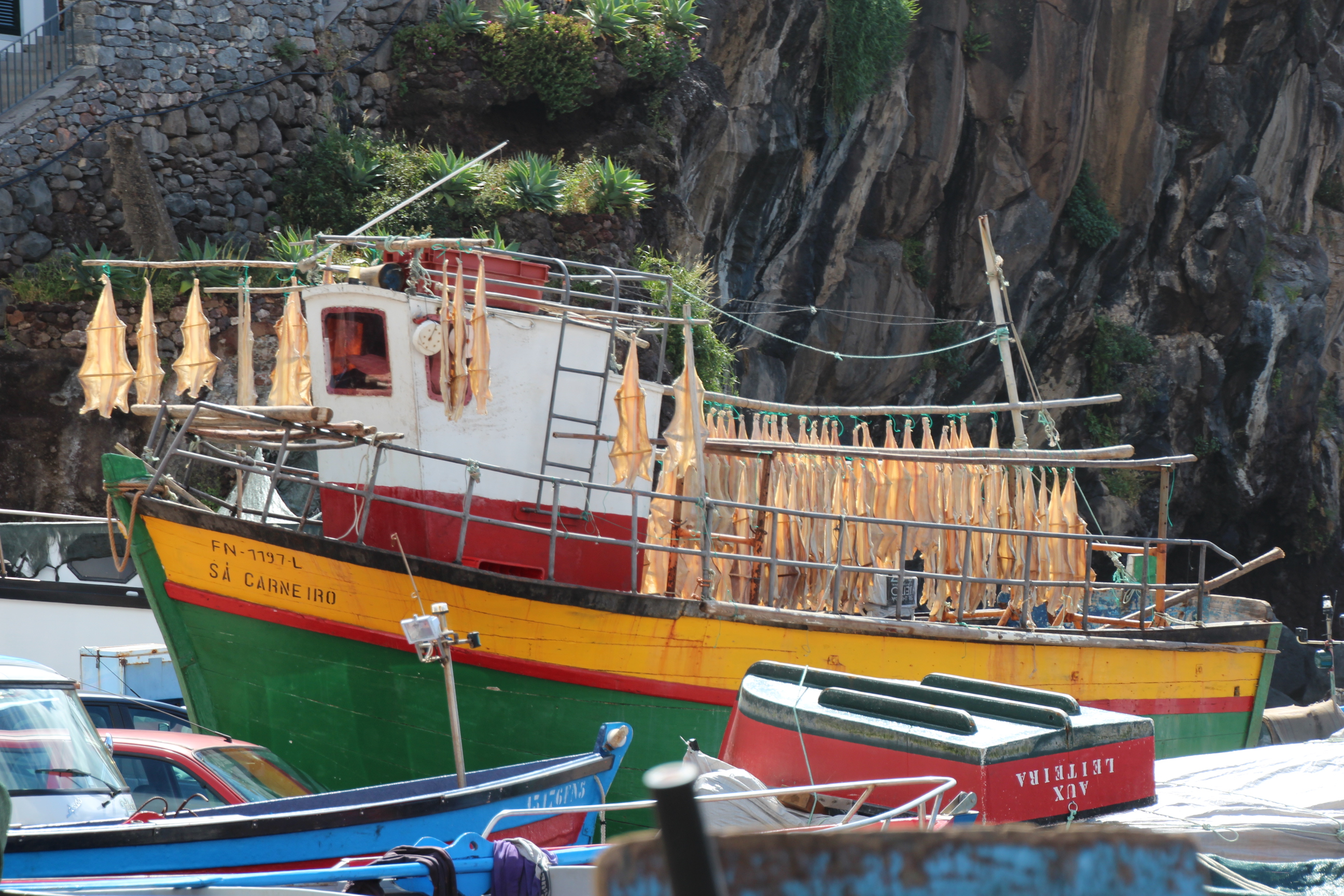 Der vierte Tag bricht an und bringt Sonnenschein und herrliches Wetter. Endlich können wir uns aus Schwerwettergewand und Stiefeln schälen, die wir wg Kälte in der Nacht und Regen die meiste Zeit auf Deck anhatten. Der Temperaturunterschied zwischen Portugal und der Gegend von Madeira ist mehr als deutlich zu spüren. Und dann gegen 10 Uhr heißt es erstmals: