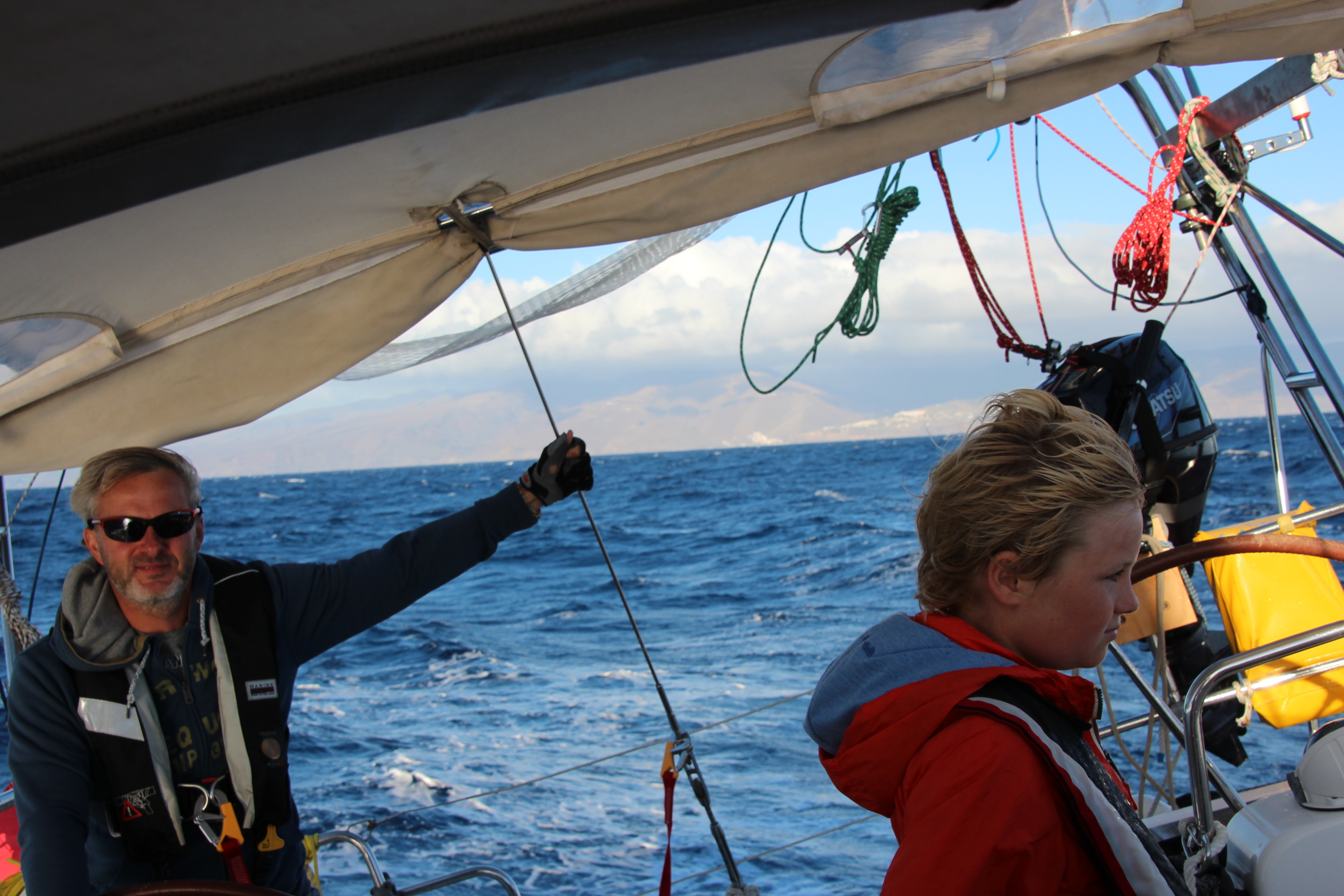 Aber dann – „all of a sudden“ – schläft der Wind ein. Gerade einmal 6 kn Wind. Deutlich weniger noch als in den Gribfiles vorhergesagt. Wir reffen aus. Aber es hilft nichts. Mit gerade einmal 2-3 Knoten zuckeln wir so dahin. Der Pico de Teide (Spaniens höchster Berg) hält wohl den ganzen Wind auf.