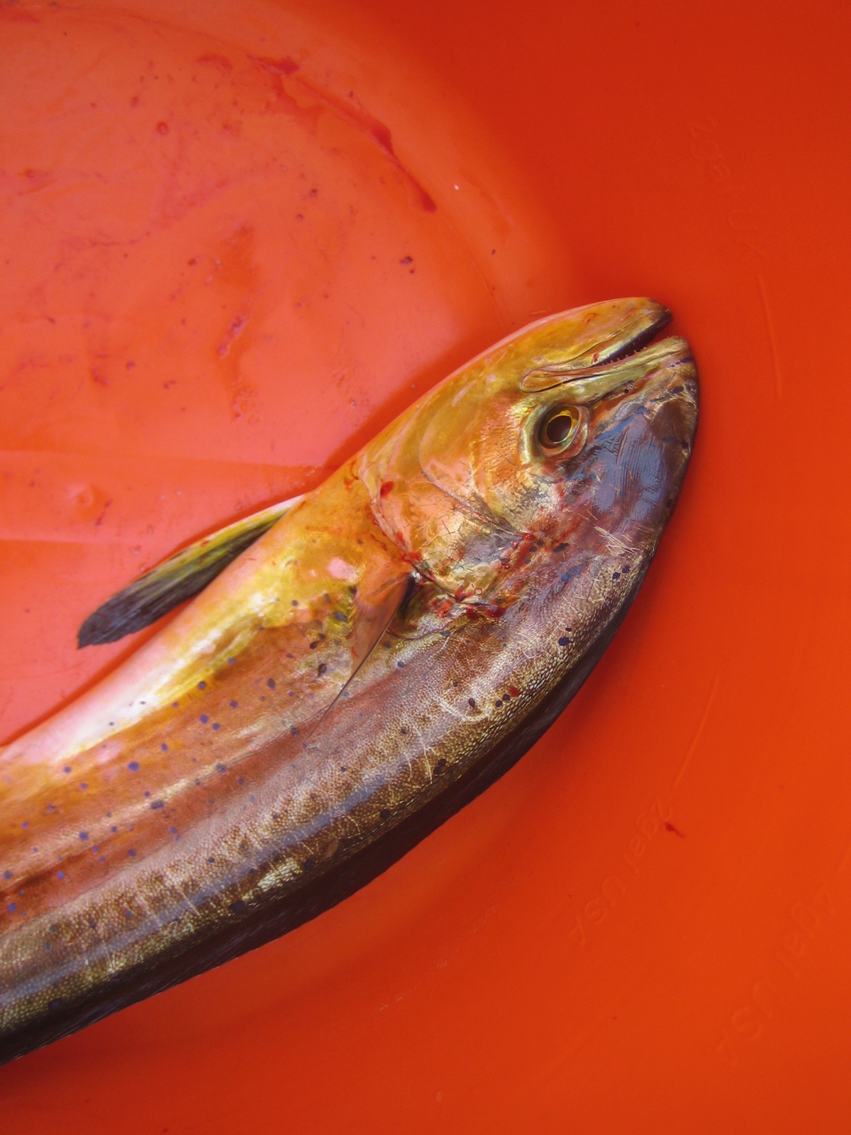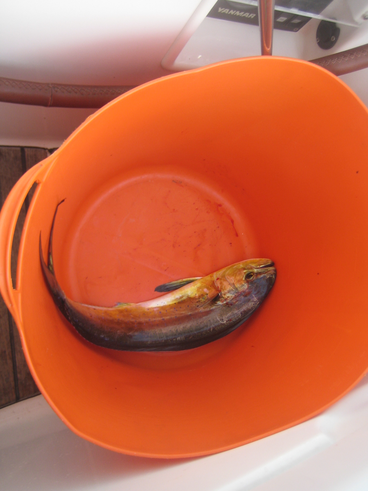 Traude geht es ganz besonders schlecht. Florian hängt auch etwas schief, nur Katharina und Lukas sind motiviert genug, die Schleppangel rauszuhängen. Und kaum eine halbe Stunde später hören wir erstmals das langersehnte Ratschen. „Ein Fisch!!!!“ Unser erster Fisch. Mit vereinten Kräften holen wir das Prachtexemplar mit 40 cm Länge und 1 kg Gewicht an Bord.