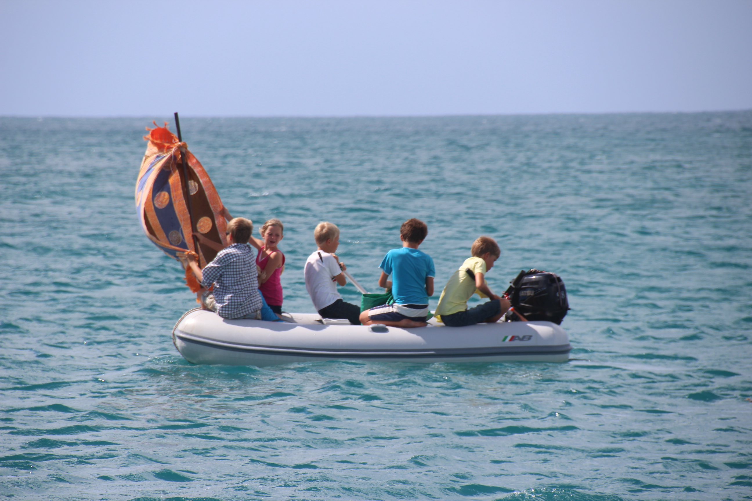Dann wir ein langgehegter Plan umgesetzt – Enterprise und Starship Kids segeln mit dem Dinghi. Der Mast besteht aus einem langen Stecken und als Spinnaker muss ein Sarong herhalten. Dann setzen sie sogar noch ein zweites Segel – ein Handtuch quer. Ungewöhnlich, aber erfolgreich segeln (oder treiben?) sie vor dem Wind mehrmals die Bucht hinaus.