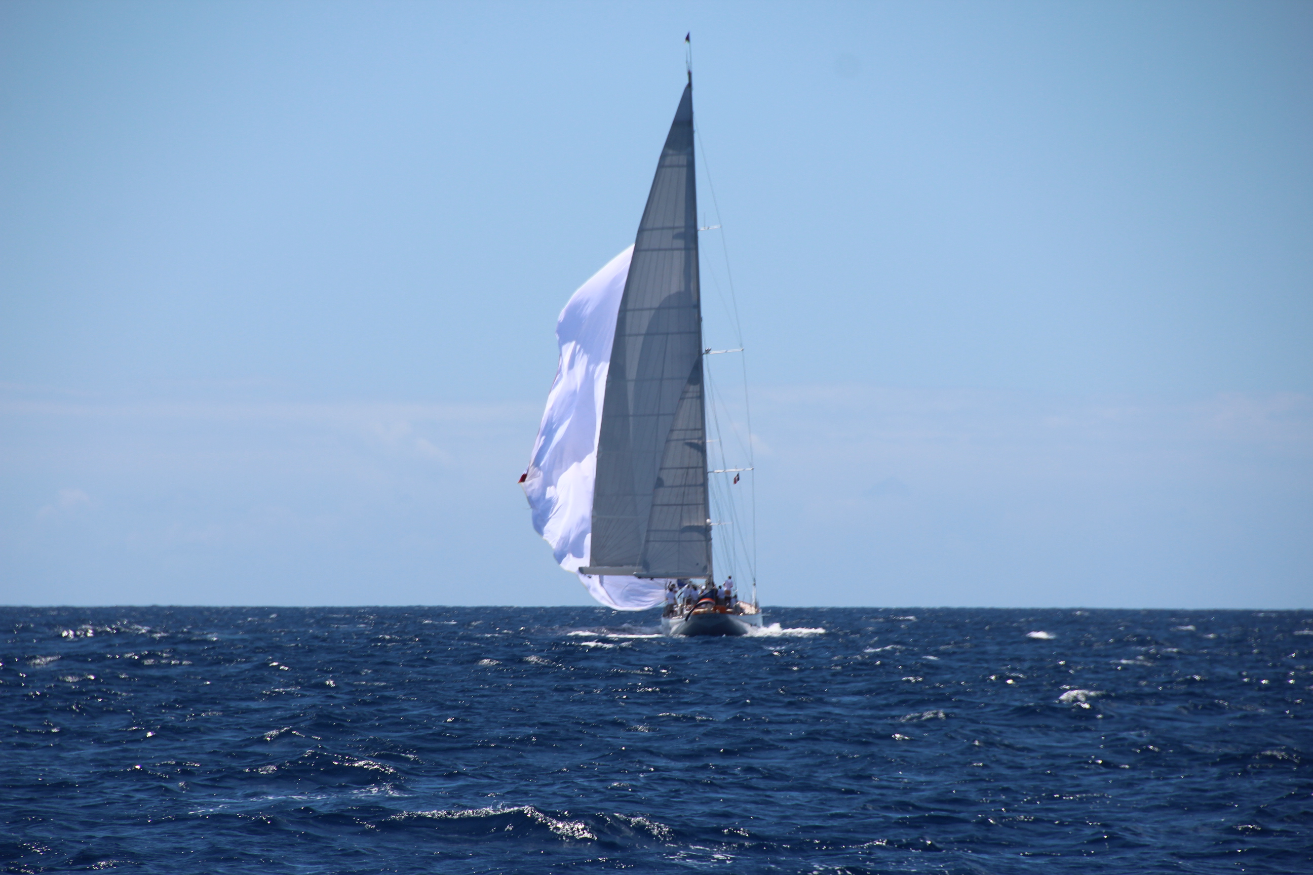 Am nächsten Tag – auf dem Weg nach St. Martin – verschätze ich mich in der Kalkulation, wann das Feld an uns vorbeiziehen sollte, und wir starten viel zu früh. Und müssen damit zwei Mal die Regatta queren. Adrenalin pur. Die wunderschöne PUMULA segelt ganz nahe an uns vorbei.
