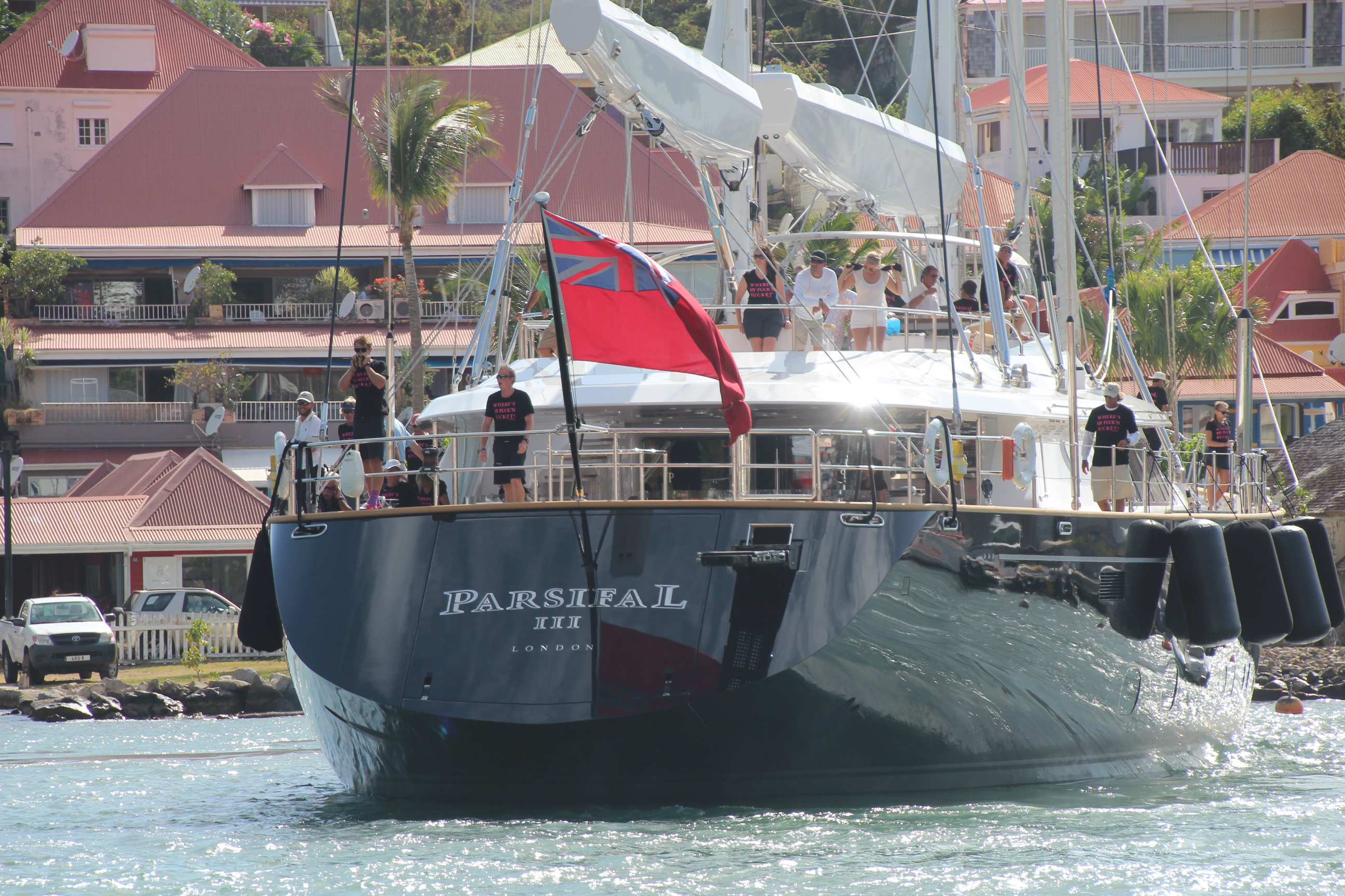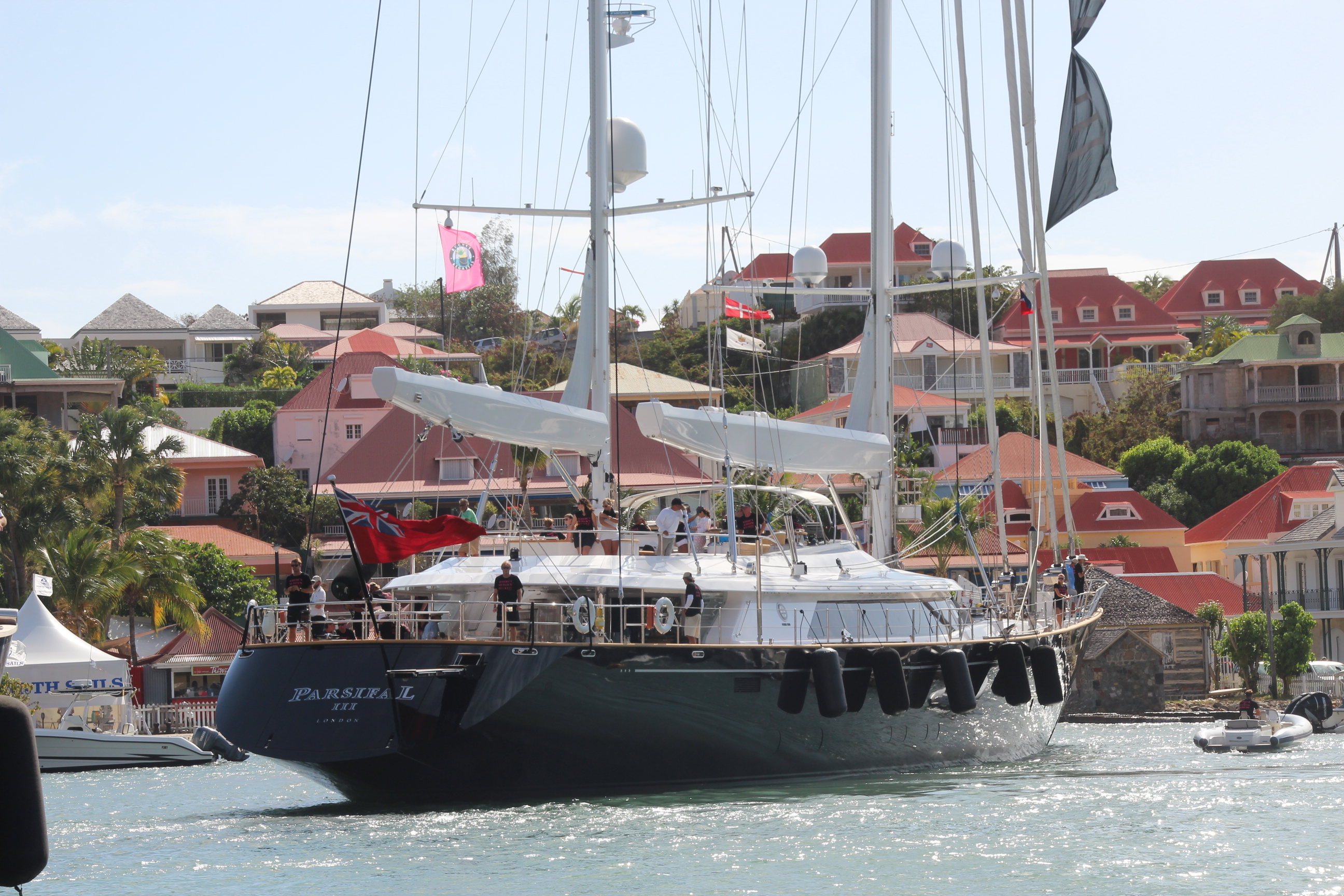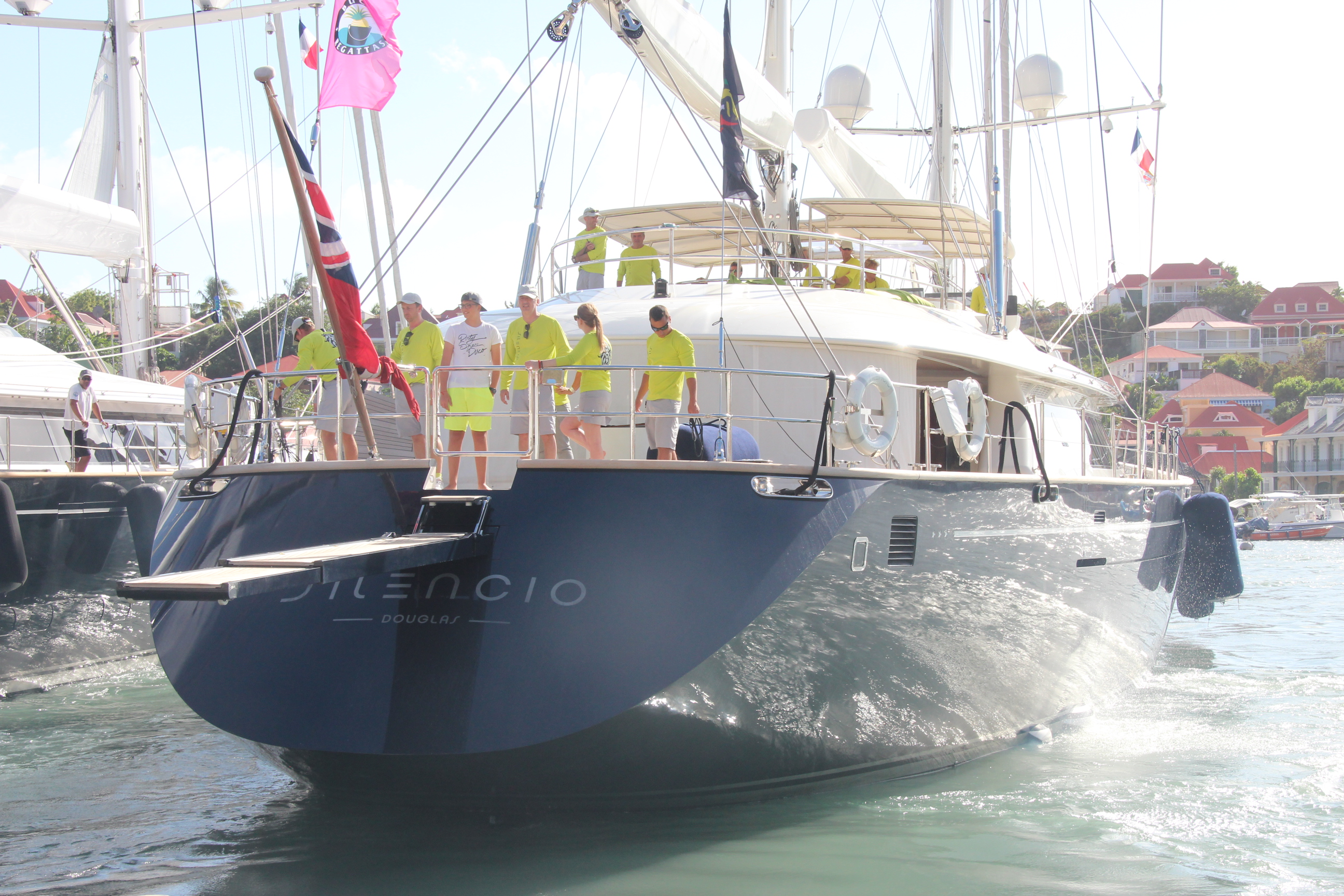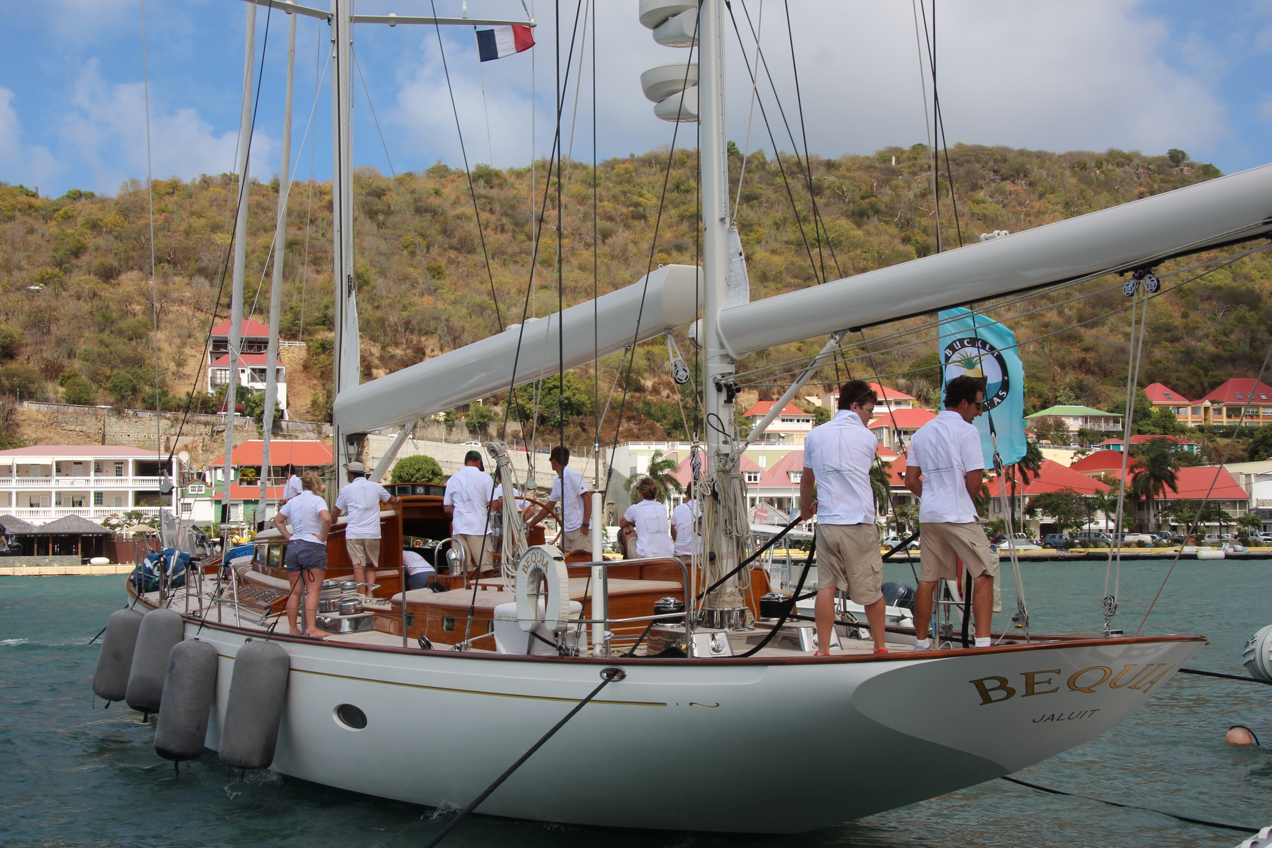 Beim Weg zurück in den Ort erreichen die ersten Jachten gerade wieder die Marina. Die Crew der siegreichen Bequia genießt ganz entspannt den Mittagslunch, während sich die Crew der 67 m langen Ketch „HETAIROS“ (Kategorie: „ Les Gazelles des Mers“), die vorzeitig aus dem Rennen ausgestiegen ist, sich um die Reparatur der Genua kümmert.