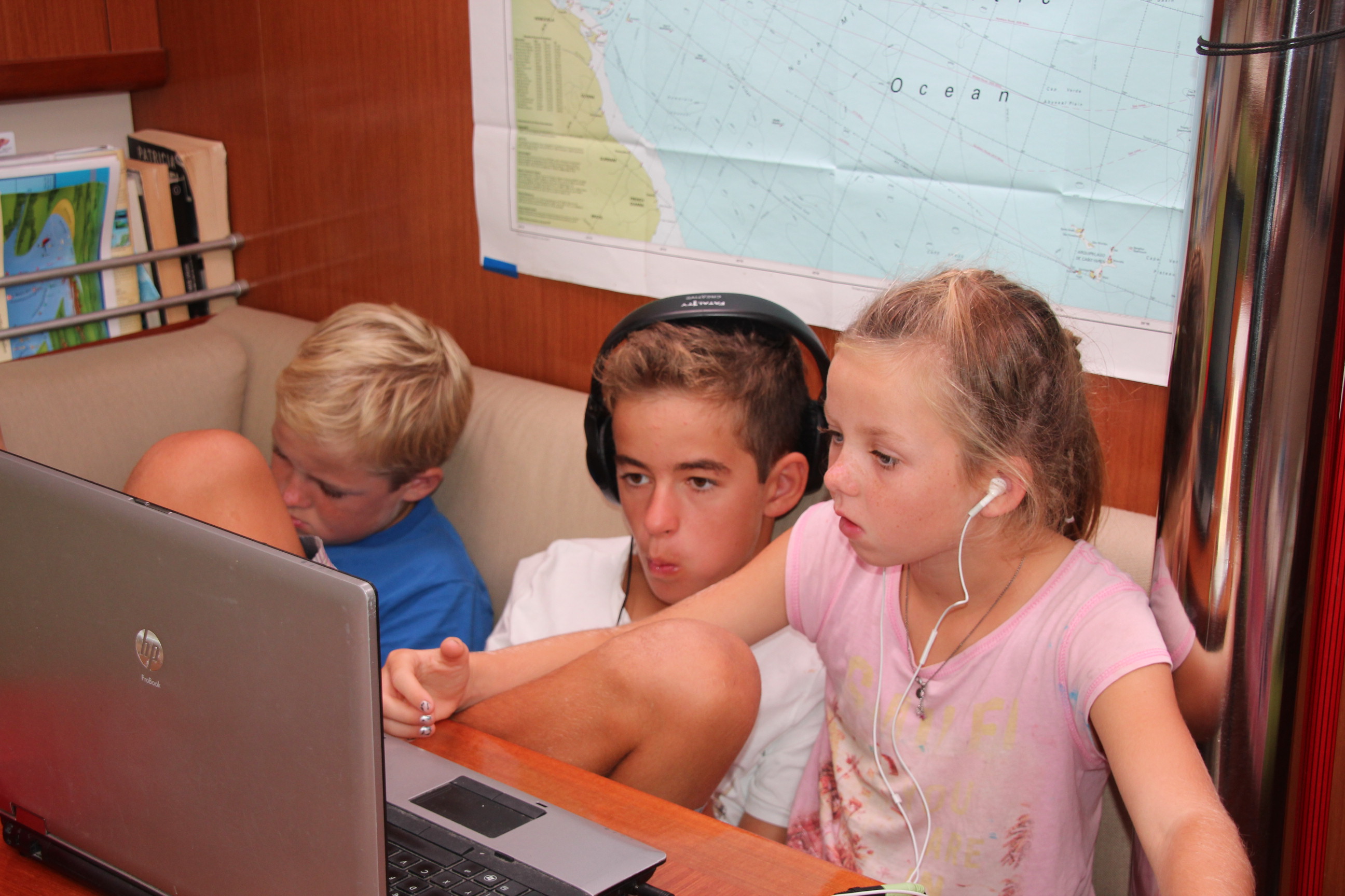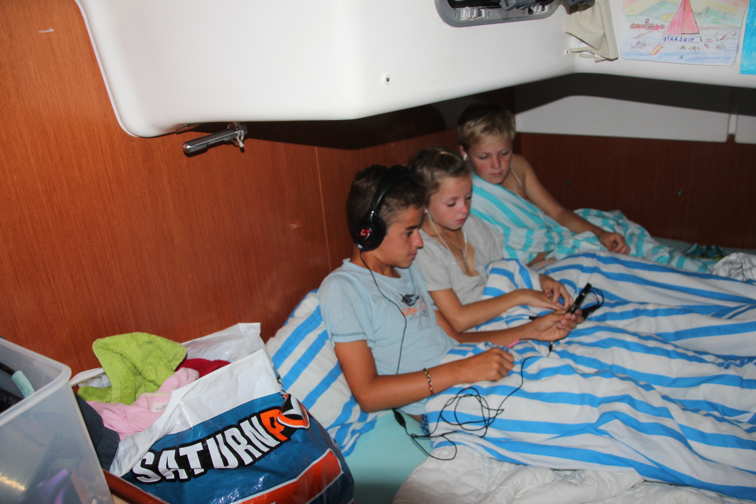 15:00 = Noch immer kein Wind. Wir fahren noch unter Motor. Die Kinder sehen Filme an und lesen.