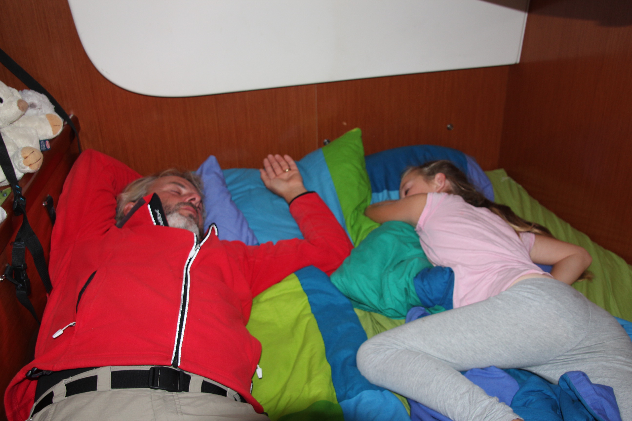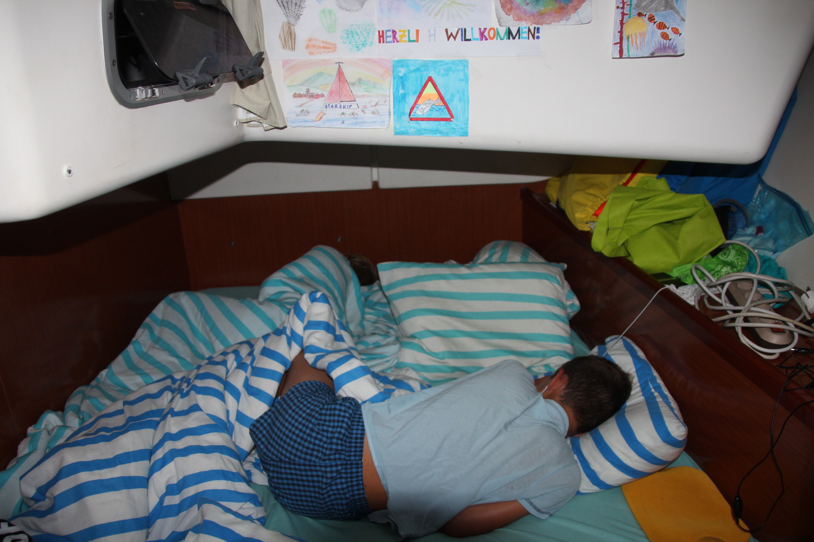 01:00 = Irgendwo in diesem Gewurschtel versteckt sich auch noch Lukas. Katharina schläft bei Überfahrten in unserem Bett.
