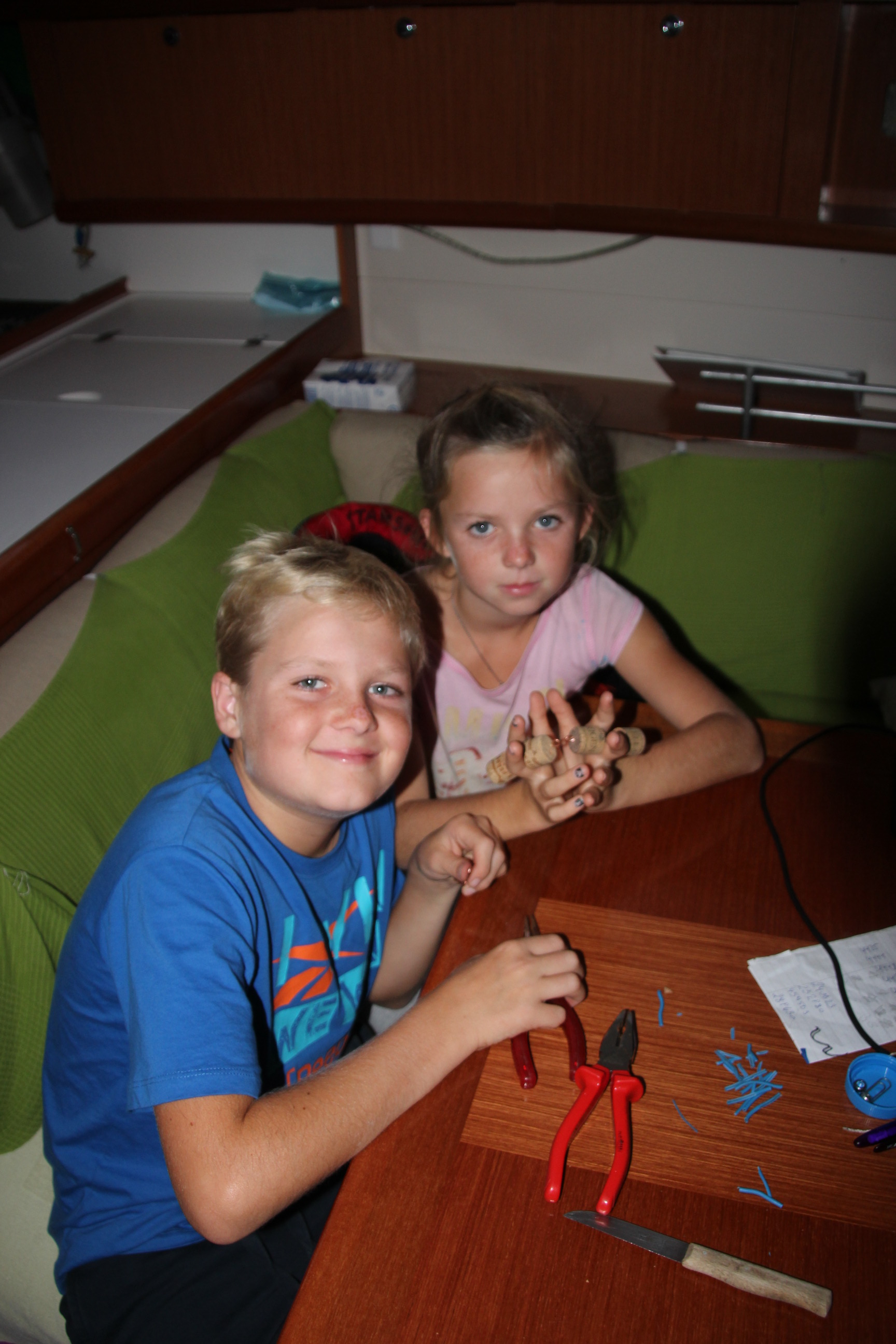 21:00 = Von Müdigkeit keine Spur. Lukas und Katharina basteln Motorräder aus Weißweinkorken und Draht.