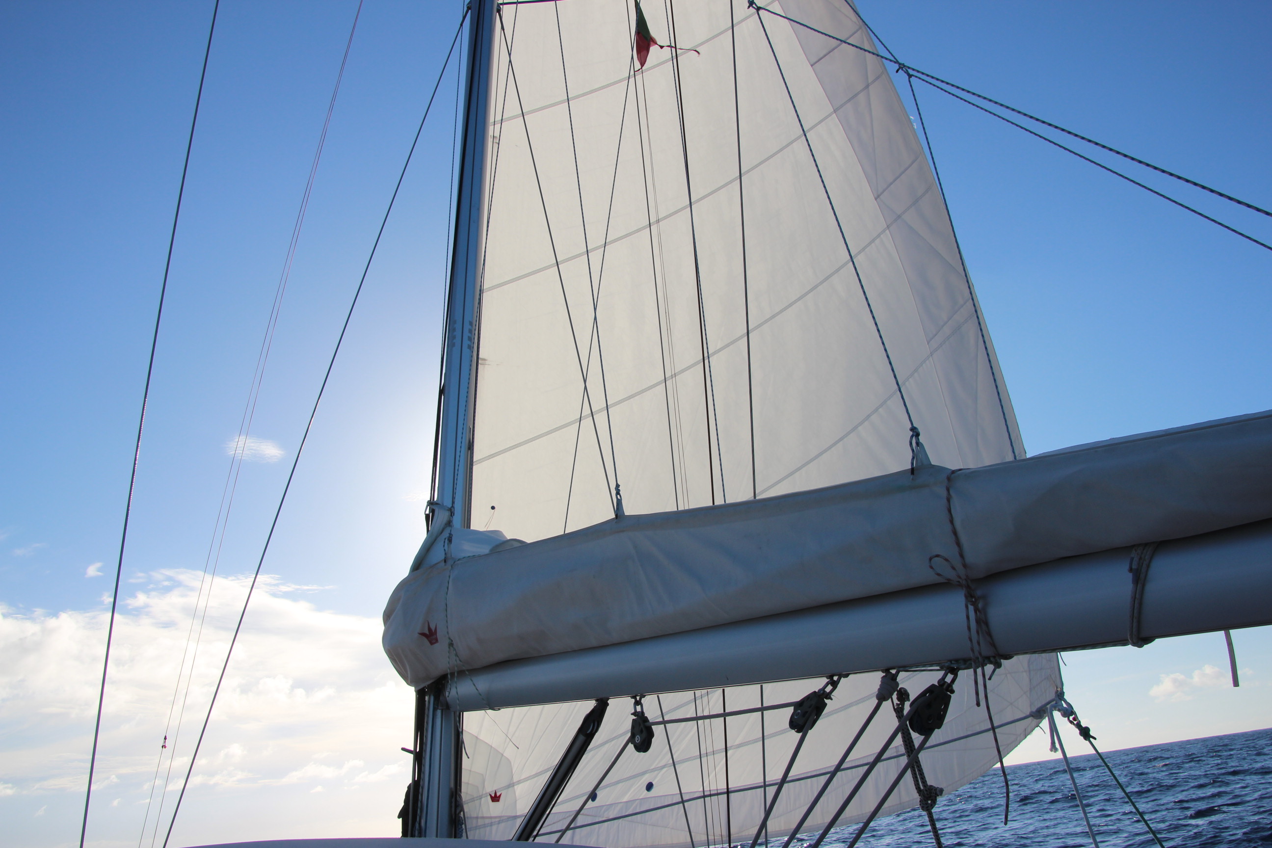 08:00 = Der Wind dreht und kommt raumschots. Wir bergen das Großsegel. Und kurz danach auch die Genua. Jetzt kommt wieder der Parasailor dran.
