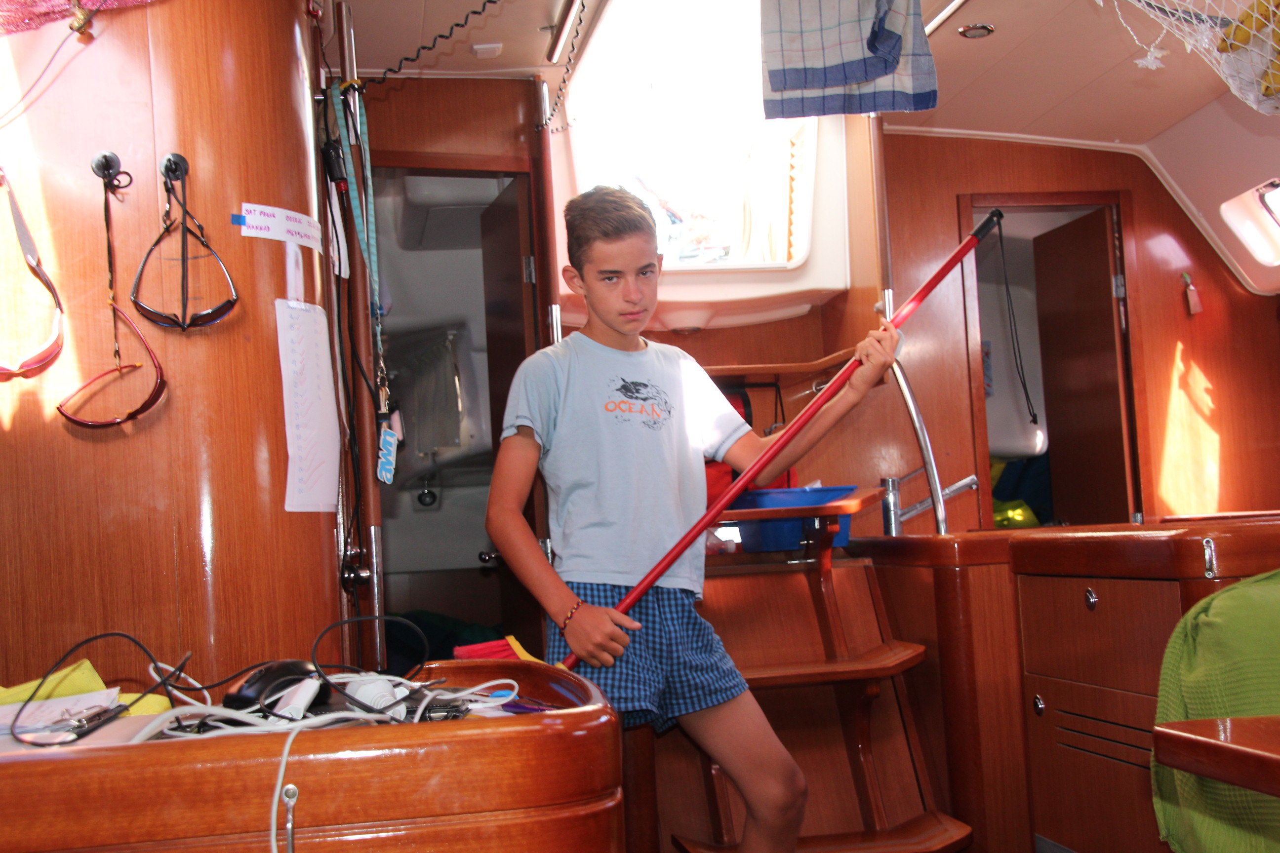 14:00 = Pizza zum Mittagessen. Und als Nachspeise ein Joghurt. Wir fahren seit einer halben Stunde unter Motor. kein Wind, keine Welle, da kann man leicht unter Deck zeichnen und spielen.