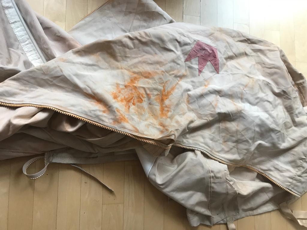 „Eigentlich“ wollen wir den alten Lazybag waschen und die Mängel ausbessern. Aber das Ergebnis des Waschganges ist ein vom Rost der Stangen orange gefärbter Lazybag. Unsere Versuche, ihn zu bleichen oder schwarz einzufärben, schlagen fehl.