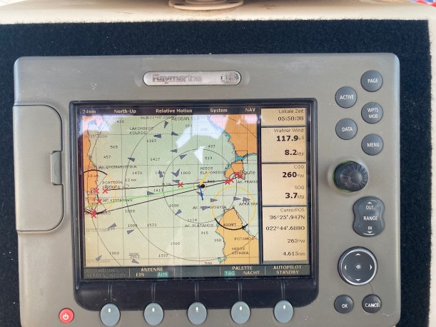 Das Gerät piepst zwar die ganze Zeit und zeigt „NO MELDUNG“, aber beim Durchscrollen der Displays stoße ich auf den heutigen Wetterbericht auf deutsch für das ionische Meer. Erstmals, nach 10 Jahren.