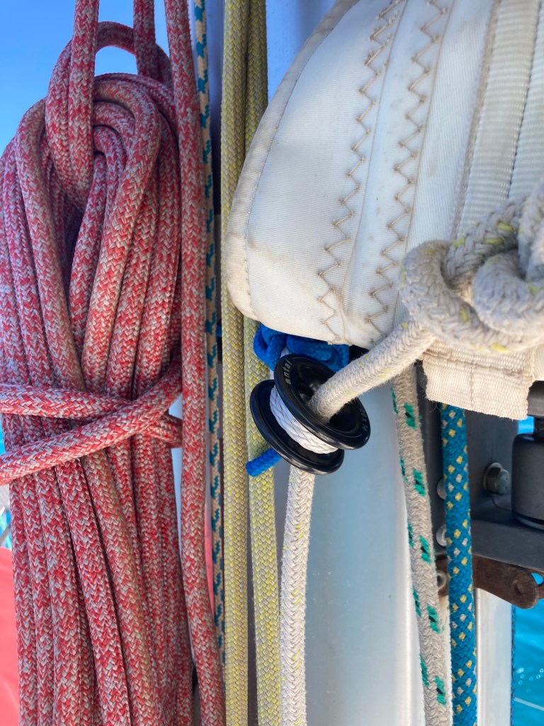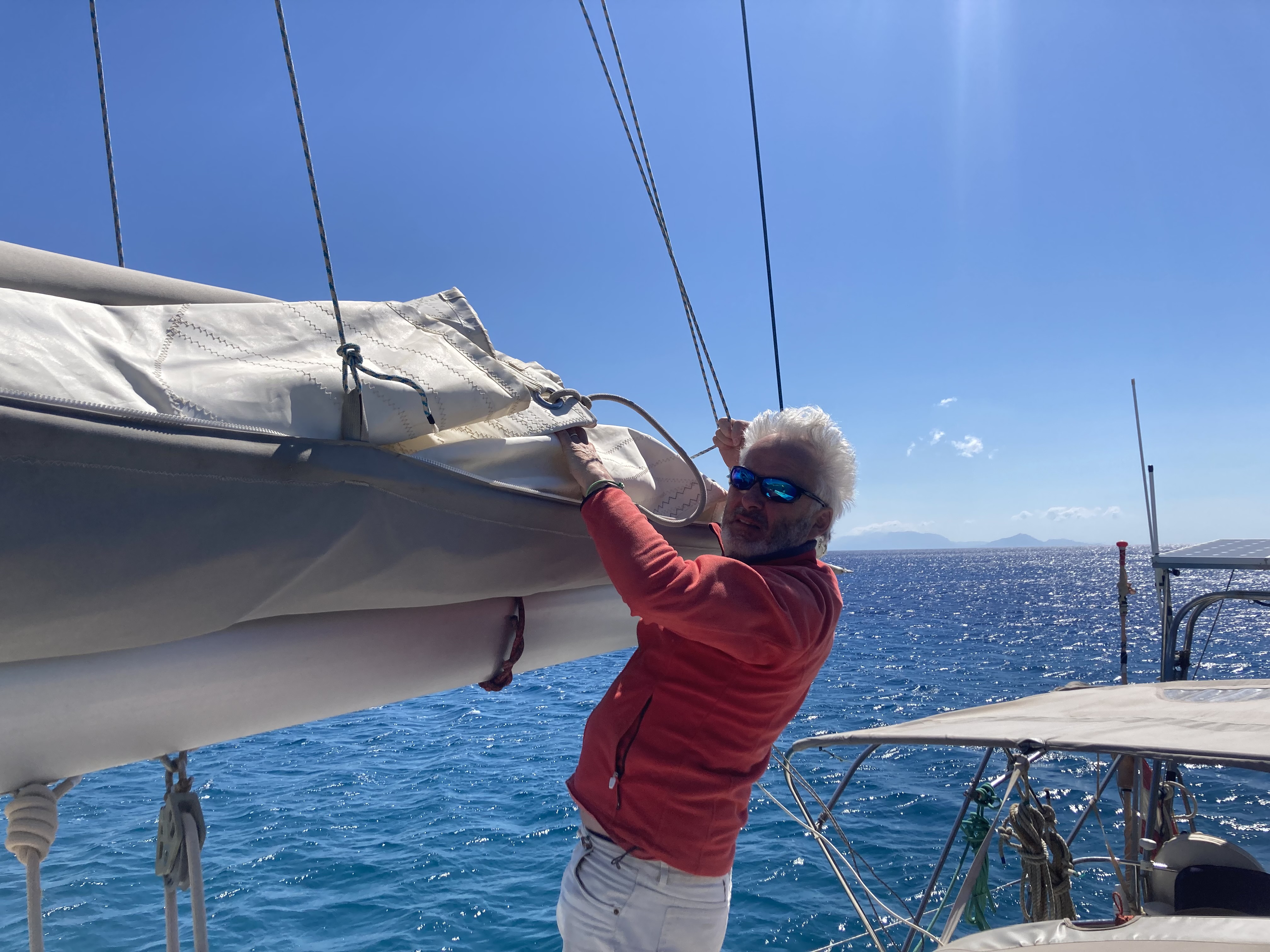 Die ersten 3 Seemeilen an der Küste von Kos sind geprägt von starken Fallböen, aber achterlichem Wind. Wir testen das neu konfigurierte dritte Reff. Passt.