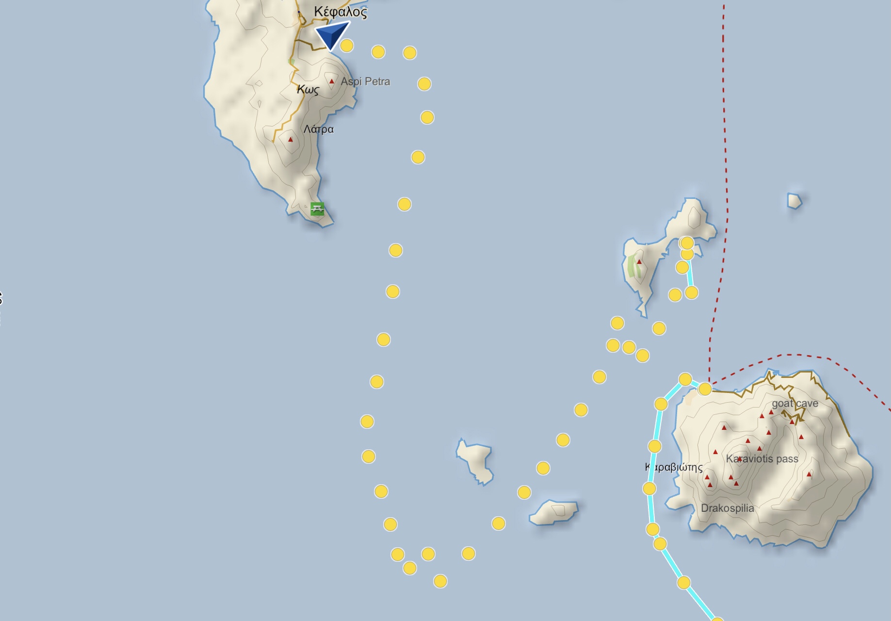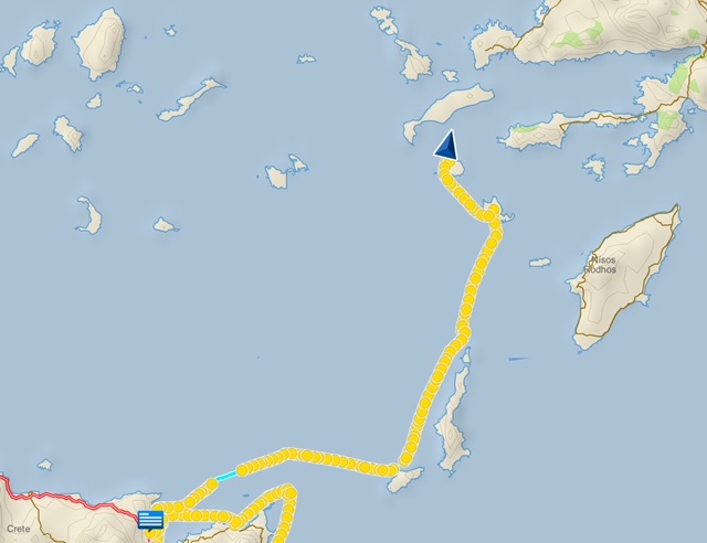 Wenige Seemeilen vor Astypalaia, bereits in der Abdeckung der Insel, sinkt die Wellenhöhe und die Fallböendynamik setzt ein. Wir wollen ziemlich genau in die Mitte der schmetterlingsförmigen Insel. Genua weg, drittes Reff und Motor an, um die letzten 4 Seemeilen zu nehmen. Motor an, weil wir durch eine enge Passage müssen und uns nicht alleine auf das Großsegel verlassen können.