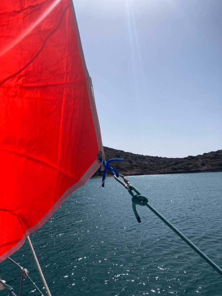 Der einzige Nachteil dieser wunderschönen Bucht ist, dass sie besonders anfällig auf Fallböen ist. Unseren Plan, zum Abendessen in die örtliche Taverne zu fahren, geben wir bald auf. Das große und schwere Dinghi mit dem Spinnakerfall von Vordeck ins Wasser zu hieven, ist schon bei wenig Wind herausfordernd. Beim Abendessen im Salon steigt der Wind auf 28 Knoten. Zu Sicherheit (eigentlich zur Schonung der Ankerwinsch) führen wir einen Metallstift durch die Ankerkette und das Ankergeschirr, für den Fall, dass die Ankerkralle reißt.
